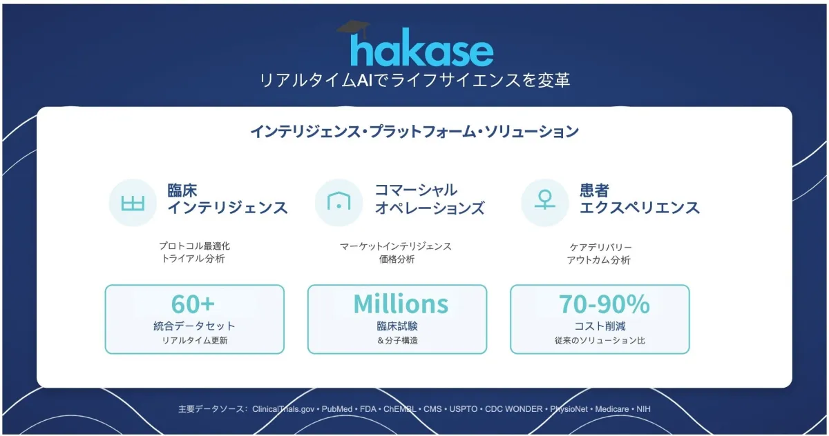 「Hakase AI」は、臨床、商業、ケアの3つのモジュールにわたる60以上のヘルスケアデータセットを統合したプラットフォームです。数百万件に及ぶ臨床試験情報や、規制文書、システムデータをもとに専用AIモデルを構築しており、これにより予測分析、プロトコル最適化、創薬プロセスの加速、さらにはマーケットインテリジェンスの強化が期待されています。