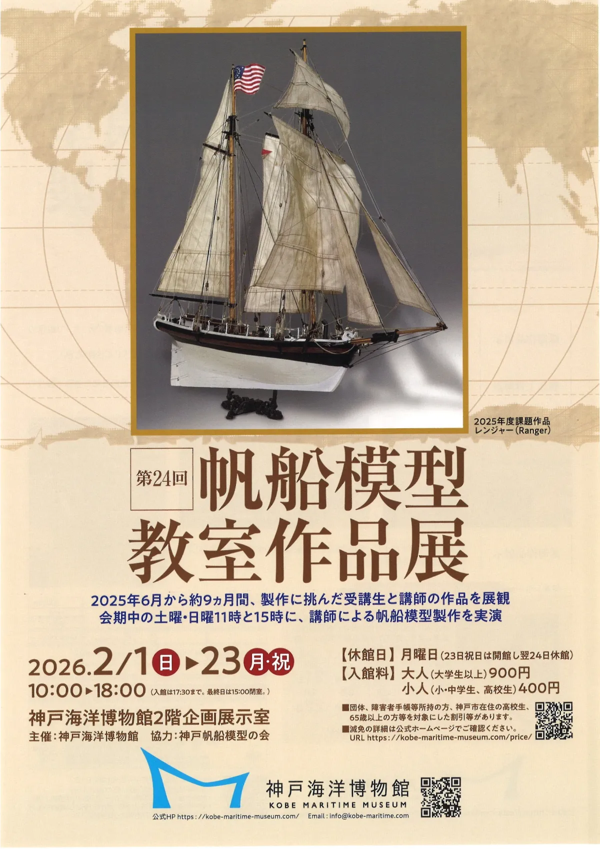 2026年2月1日から2月23日まで、神戸海洋博物館の2階企画展示室では、「第24回 帆船模型教室作品展」が行われます。この特別展では、神戸海洋博物館が主催し、神戸帆船模型の会と協力して行われるプログラムとして、約20点の作品が展示されます。これらの作品は、2025年度の帆船模型教室の受講生と講師たちが力を合わせて制作したものです。