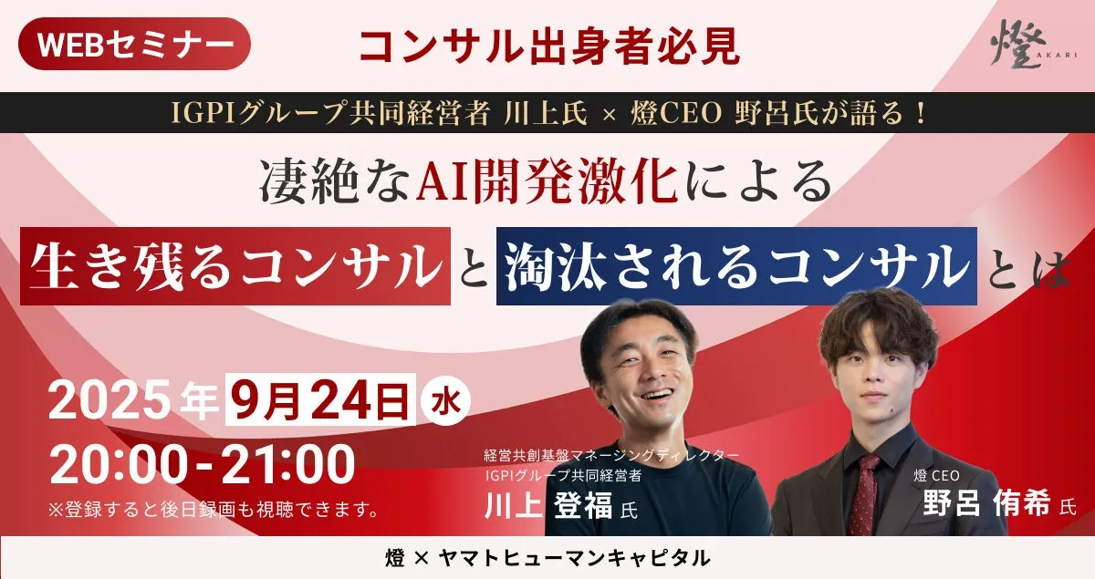 日本のAIスタートアップ「燈株式会社」のCEOである野呂侑希氏と、株式会社経営共創基盤のマネージングディレクターである川上登福氏が登壇します。多くの人が感じる「AI時代におけるコンサルタントの未来への不安」について、彼らは自身の見解と経験を基に詳しく説明する予定です。
