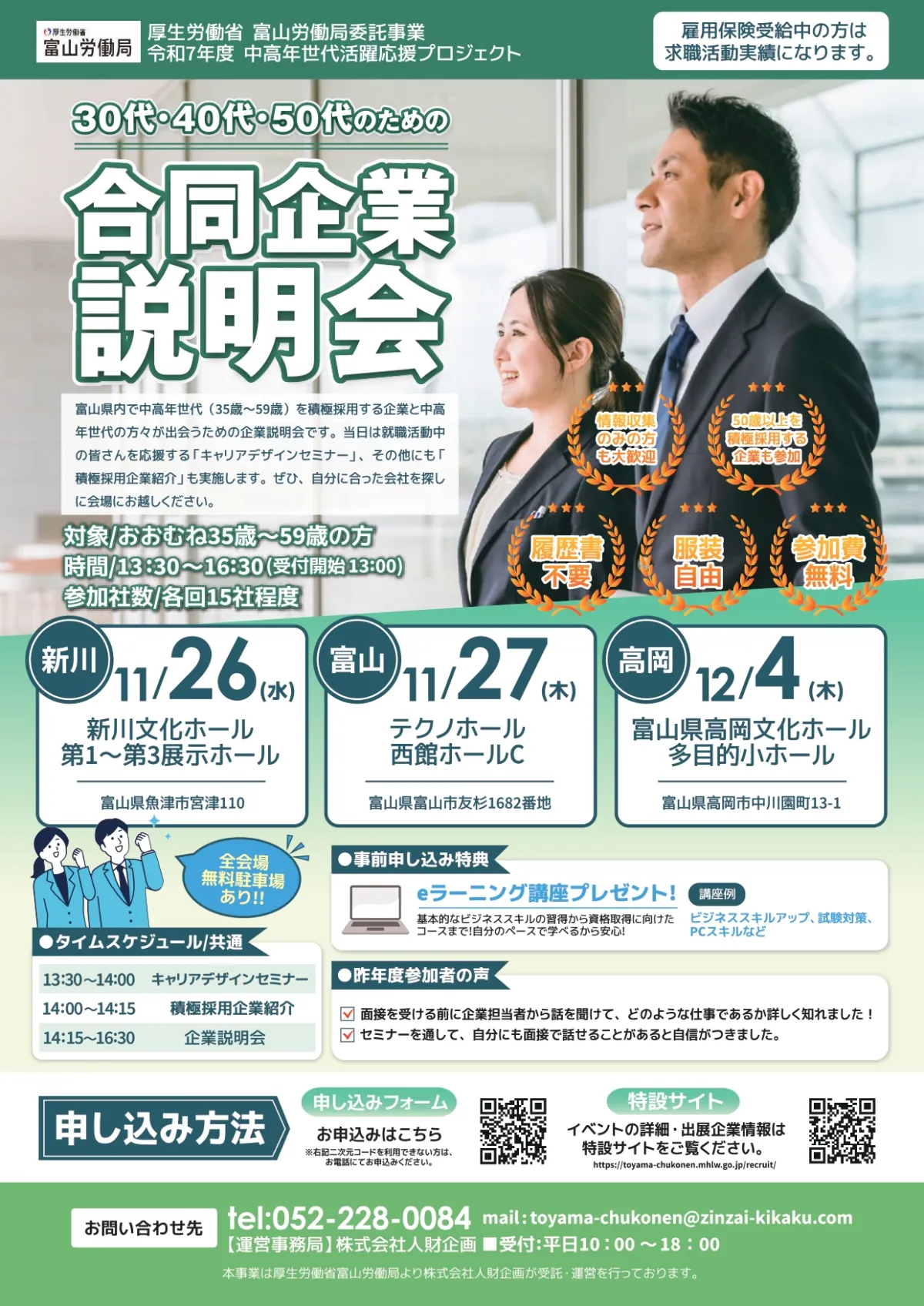 富山労働局はこのイベントを通じて、中高年世代がよりよい未来に向かって新たな職を見つける手助けをすることを目指しています。何か質問がある場合は、富山労働局「中高年世代活躍応援プロジェクト」運営事務局までお気軽にお問い合わせください。