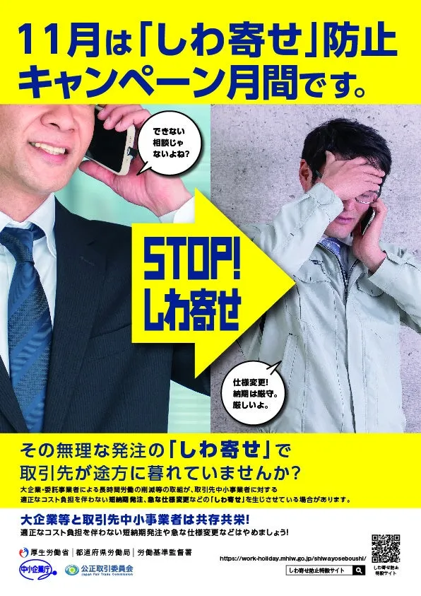 厚生労働省は、11月を「『しわ寄せ』防止キャンペーン月間」として制定しました。この取り組みは、中小企業に対する"しわ寄せ"の問題に対処することを目的としています。具体的には、大企業が働き方改革を進める一方で、その影響が中小企業に負担を強いる現状を改善するための活動です。