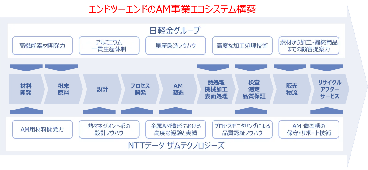 2023年9月、日本軽金属株式会社と株式会社NTTデータ ザムテクノロジーズは、金属AM(Additive Manufacturing)事業における戦略的パートナーシップ契約を締結しました。この提携により、両社は材料の開発から設計、製造、そして後加工までを網羅したエンドツーエンドのエコシステムを構築し、企業のAM事業の成長と拡大を支援する「オールインワンパートナー」を目指します。