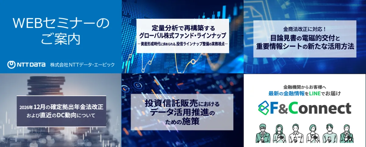 株式会社NTTデータ・エービック(所在地:東京都港区)は、金融機関様の投資信託販売を支援するセミナーを5月に開催します。特に注目すべきは、営業現場でのデータ活用や法律改正への対応など、最新のトピックに焦点を当てた5つのWEBセミナーです。以下に、各セミナーのテーマとその内容について詳しくご紹介します。