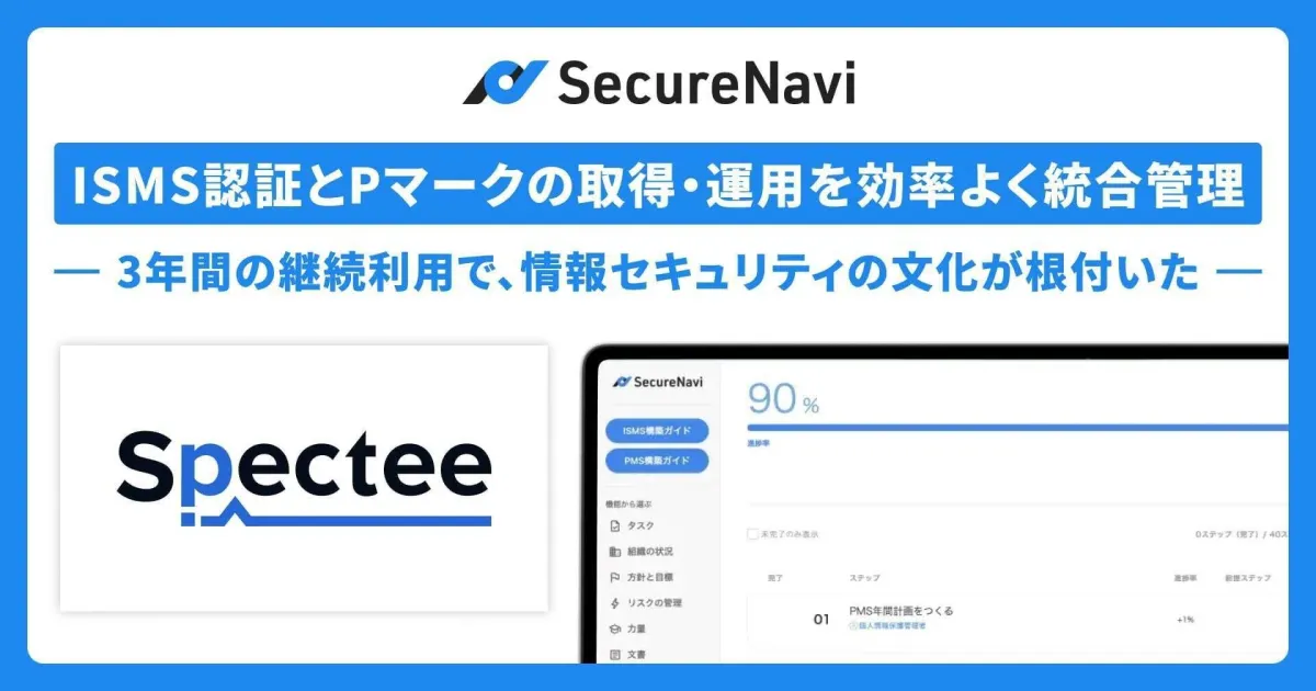 株式会社Specteeが導入したISMS・Pマークオートメーションツール「SecureNavi」は、情報セキュリティの文化を可視化し、運用の効率化を実現しました。今回、ISMS認証に続いてPマークも取得したことで、より安心安全な企業体制の構築に成功しています。