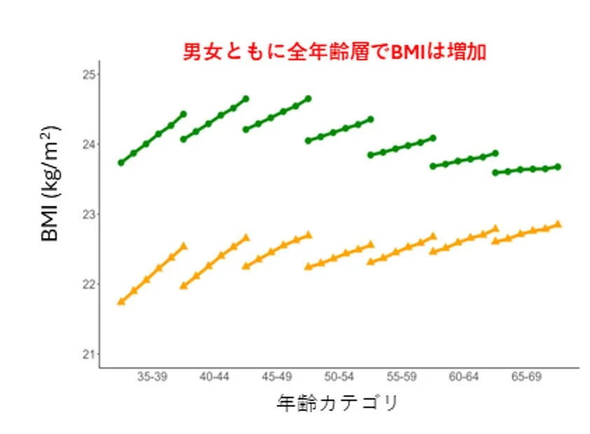 研究の結果、全年齢層においてBMI(体格指数)が増加していることが明らかとなりました。特に、性別や年齢による14の集団ごとに分析したところ、男女ともに全ての年齢層で体重が増加していることが確認されました。これに対し、65歳以上の男性は体重が減少する傾向にあるものの、身長も短縮しているため、最終的にはBMIが増加する結果となっています。