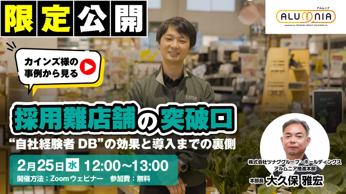 株式会社ツナググループ・ホールディングスが主催するオンラインセミナー『採用難店舗の突破口、自社経験者DBの効果と導入までの裏側』が2026年2月25日(水)に開催されます。このセミナーは、特に人事・採用に関わる関係者に向けた内容となっており、現在の厳しい採用環境を乗り越えるための具体的な手法について詳しく解説します。