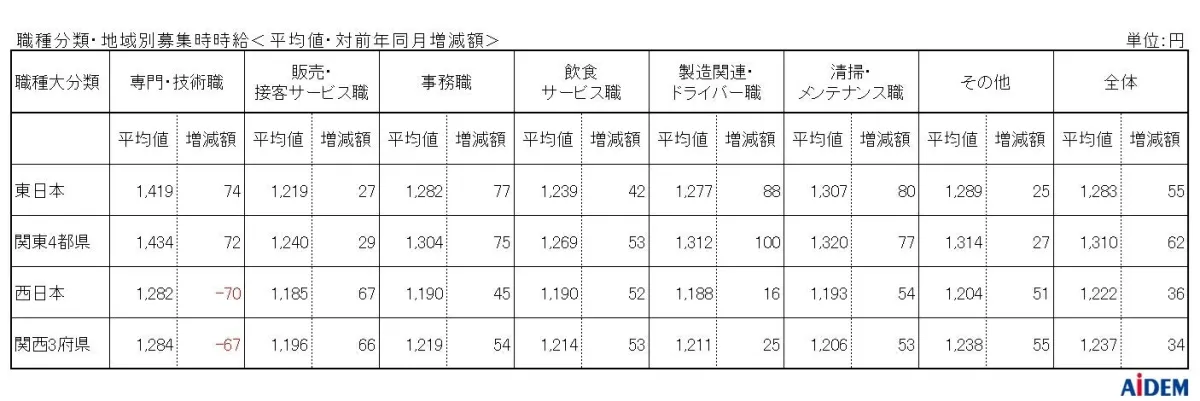 一方、西日本エリアでは、全体平均時給が前年同月比で36円増の1,222円になりました。この中で注目されるのは、「専門・技術職」の時給が前年より70円減少したものの、「清掃・メンテナンス職」や「事務職」、「飲食サービス職」など5つの職種が平均時給の増加を見せました。特に関西3府県(大阪、兵庫、京都)の平均時給は、前年同月比34円の増で1,237円となり、こちらでもすべての府県が前年よりも時給が増加しています。