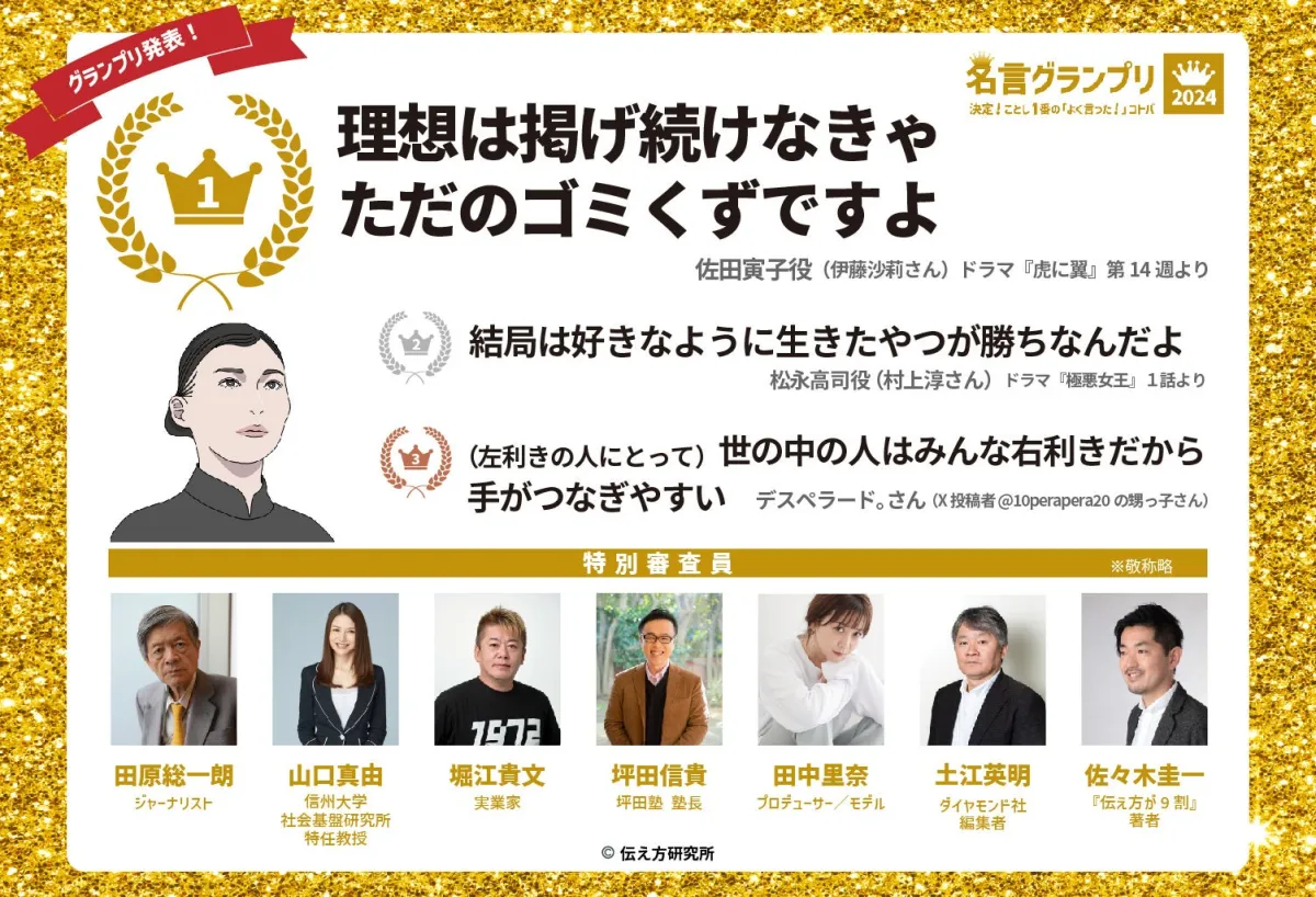 理想を掲げ続けることが難しい現代だからこそ、これらの名言が掲げられ続けることの重要性を改めて考えさせられます。2024年のグランプリは、今後の社会においてどのように言葉が人々の心に響いていくのか、期待が高まる結果となりました。