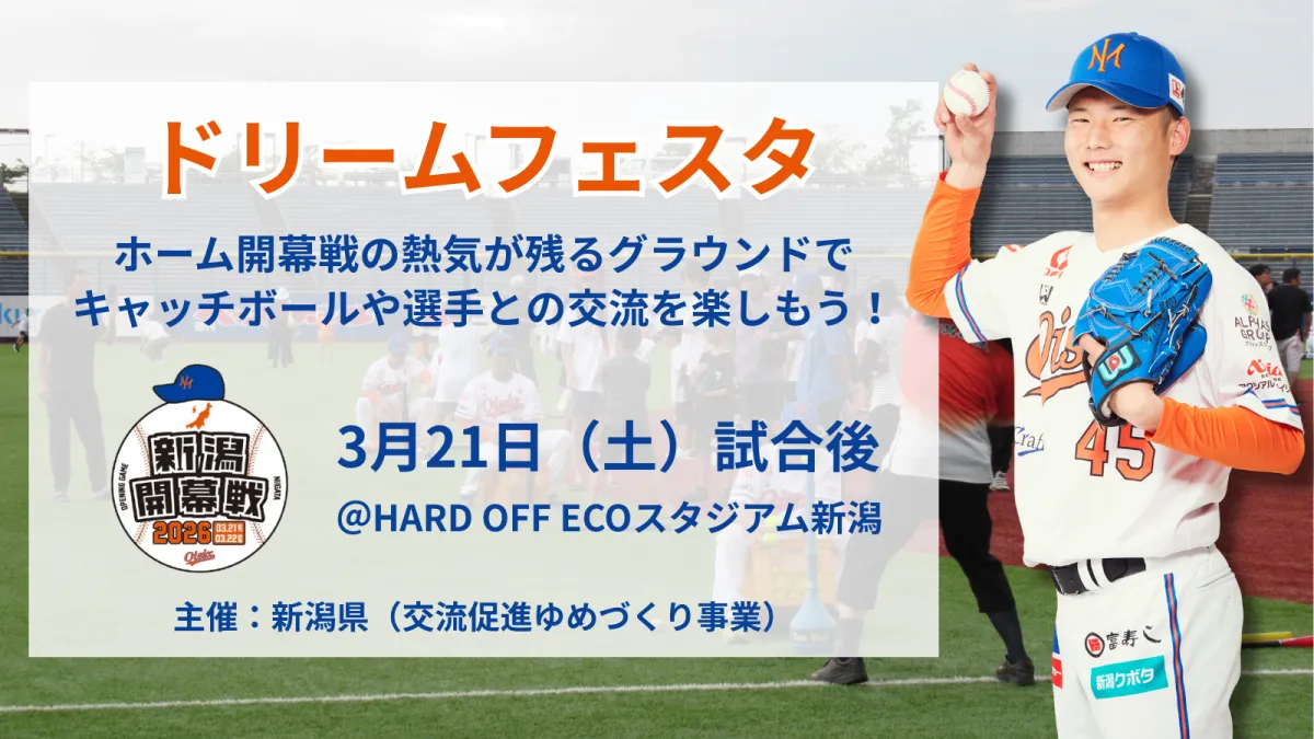 オイシックス新潟アルビレックス・ベースボール・クラブが主催する「ドリームフェスタ」が、3月21日(土)に開催されることが決まりました。今回のイベントは、新潟県主催の人気イベントで、ファンや地域の方々にとって、選手との距離が縮まる貴重な機会です。ホームゲームの熱気が残るHARD OFF ECOスタジアム新潟のグラウンドにて、気軽に楽しむことができます。