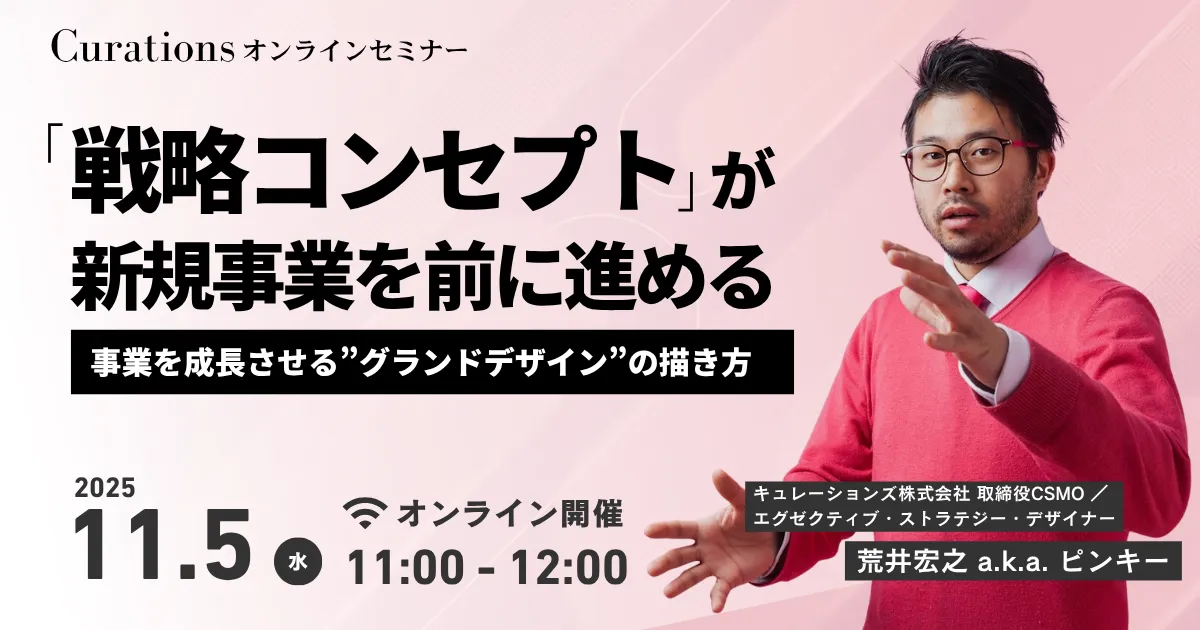 2025年11月5日(水)11:00より、キュレーションズ株式会社が主催する「製造業×新規事業 公開質問会」が開催されます。このオンラインセミナーでは、新規事業を進める上で必要不可欠な「戦略コンセプト」の重要性について深く掘り下げます。