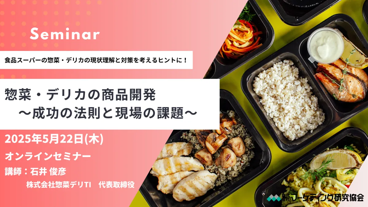 2025年5月22日、株式会社マーケティング研究協会が主催する「惣菜・デリカの商品開発セミナー」が開催されます。近年の小売業では、惣菜やデリカ商品が顧客を引きつける重要な要素になっています。今回のセミナーでは、小売業界での競争力を強化するための戦略や実践方法について、豊富な経験を持つ講師が解説します。
