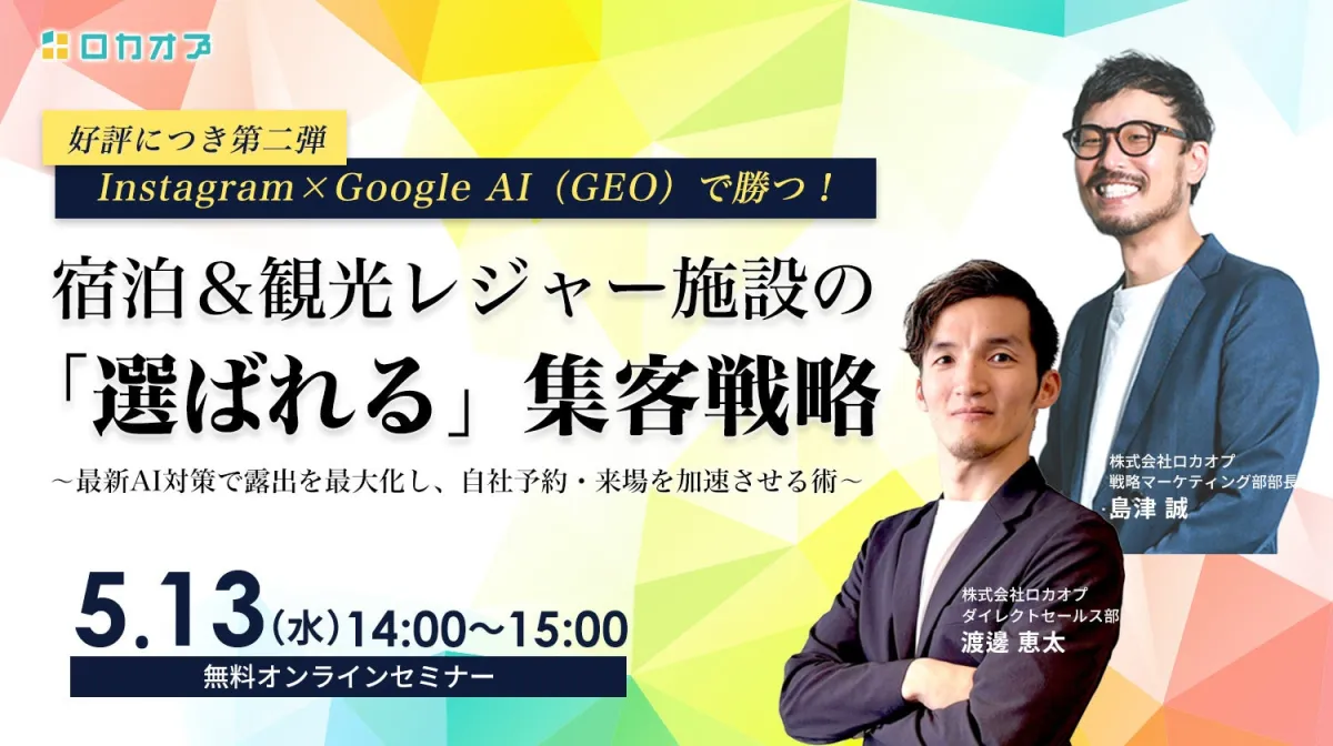 株式会社ロカオプは、宿泊や観光レジャー施設の皆様を対象にした無料オンラインセミナーを開催します。これは大好評の第一弾に続く第二弾で、タイトルは『Instagram×Google AI(GEO)で勝つ!宿泊&観光レジャー施設の「選ばれる」集客戦略 〜最新AI対策で露出を最大化し、自社予約・来場を加速させる術〜』です。