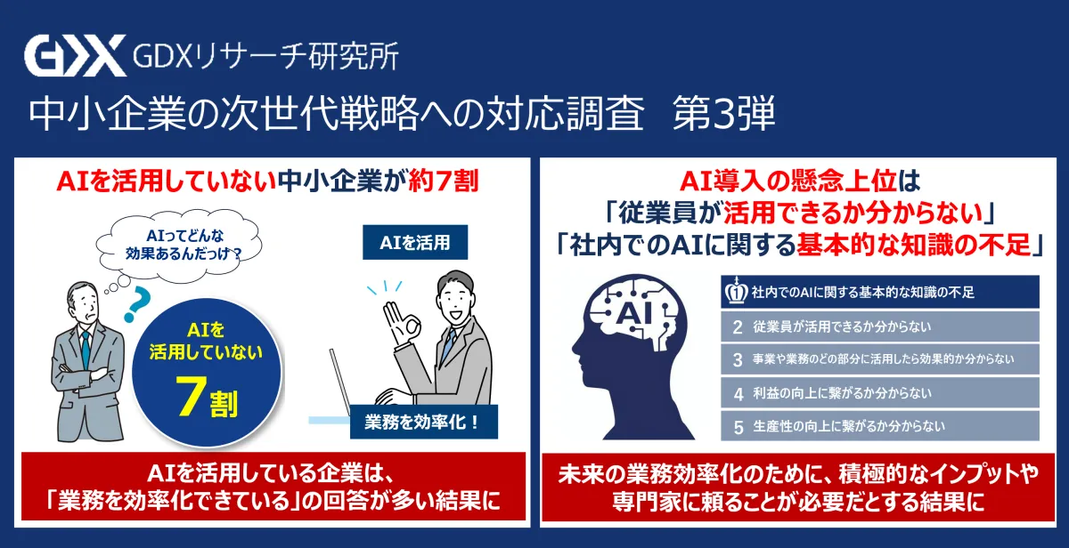 フォーバル GDXリサーチ研究所が実施した「中小企業の次世代戦略への対応調査」によれば、全国の中小企業経営者934名を対象に中小企業におけるAI活用状況が明らかになりました。調査結果は、中小企業の約7割がAIを未導入である一方、導入している企業は業務の効率化を実感していることを示しています。
