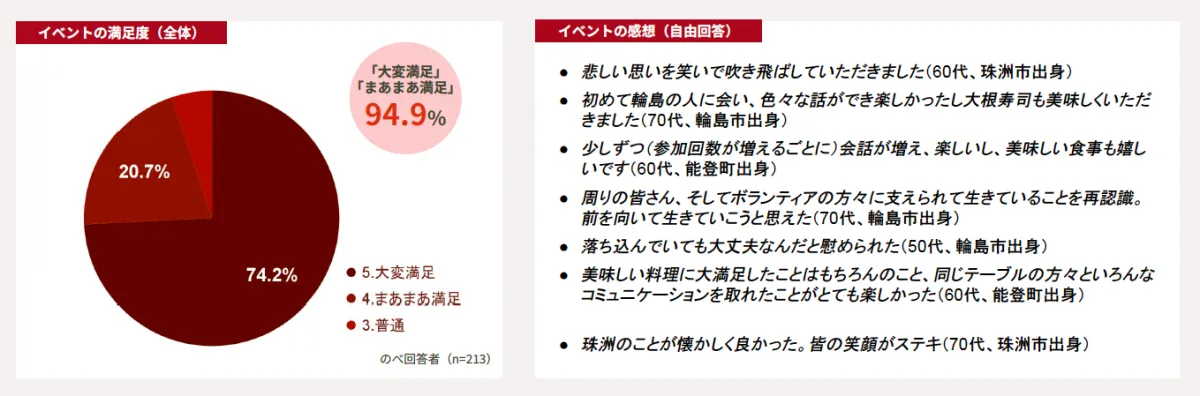 調査によると、70%を超える参加者がイベントを通じて新しい友人や知人ができたと回答しています。このことは、孤独や孤立を防ぐ上で非常に重要な意味を持っています。参加者同士の意図的な交流時間を設けたことで、互いの接点を増やし、コミュニケーションが促進される施策が功を奏したとしています。