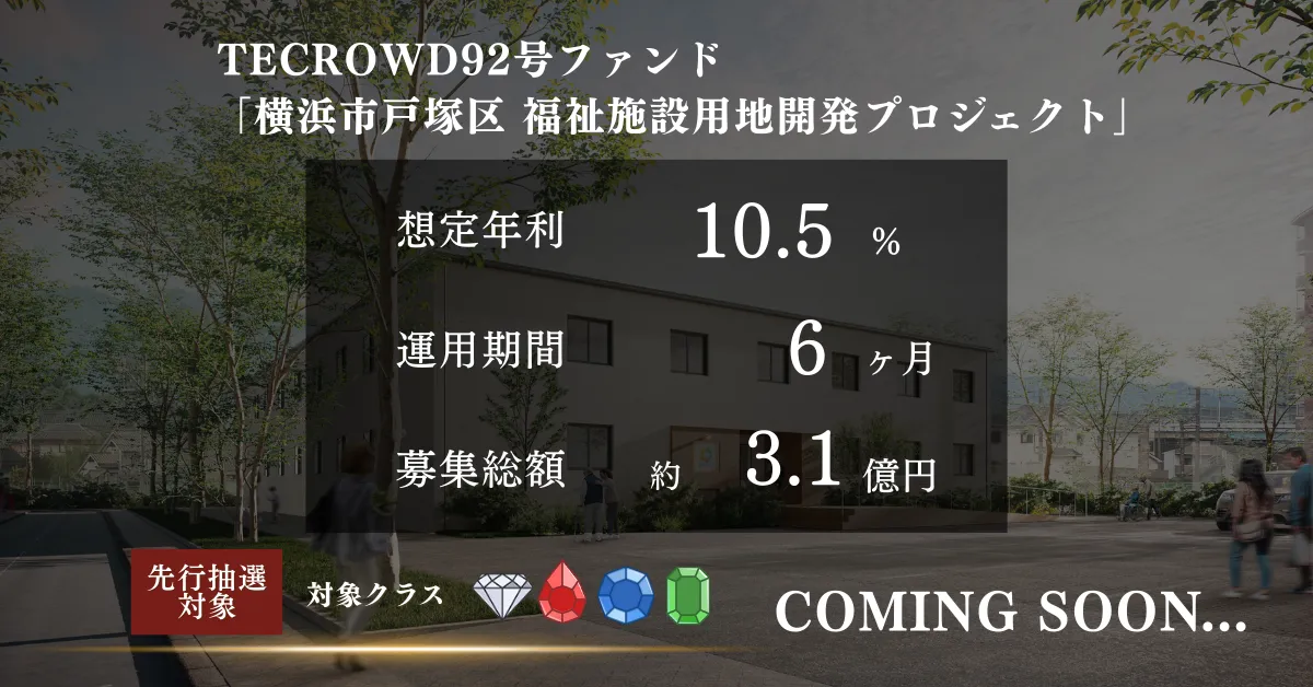 最近、不動産クラウドファンディングの世界に新たな動きがありました。それがTECROWD92号ファンド「横浜市戸塚区福祉施設用地開発プロジェクト」です。このプロジェクトは、想定年利10.5%という高利回りを実現しています。運用期間は6ヶ月、募集総額は約3.1億円にのぼります。