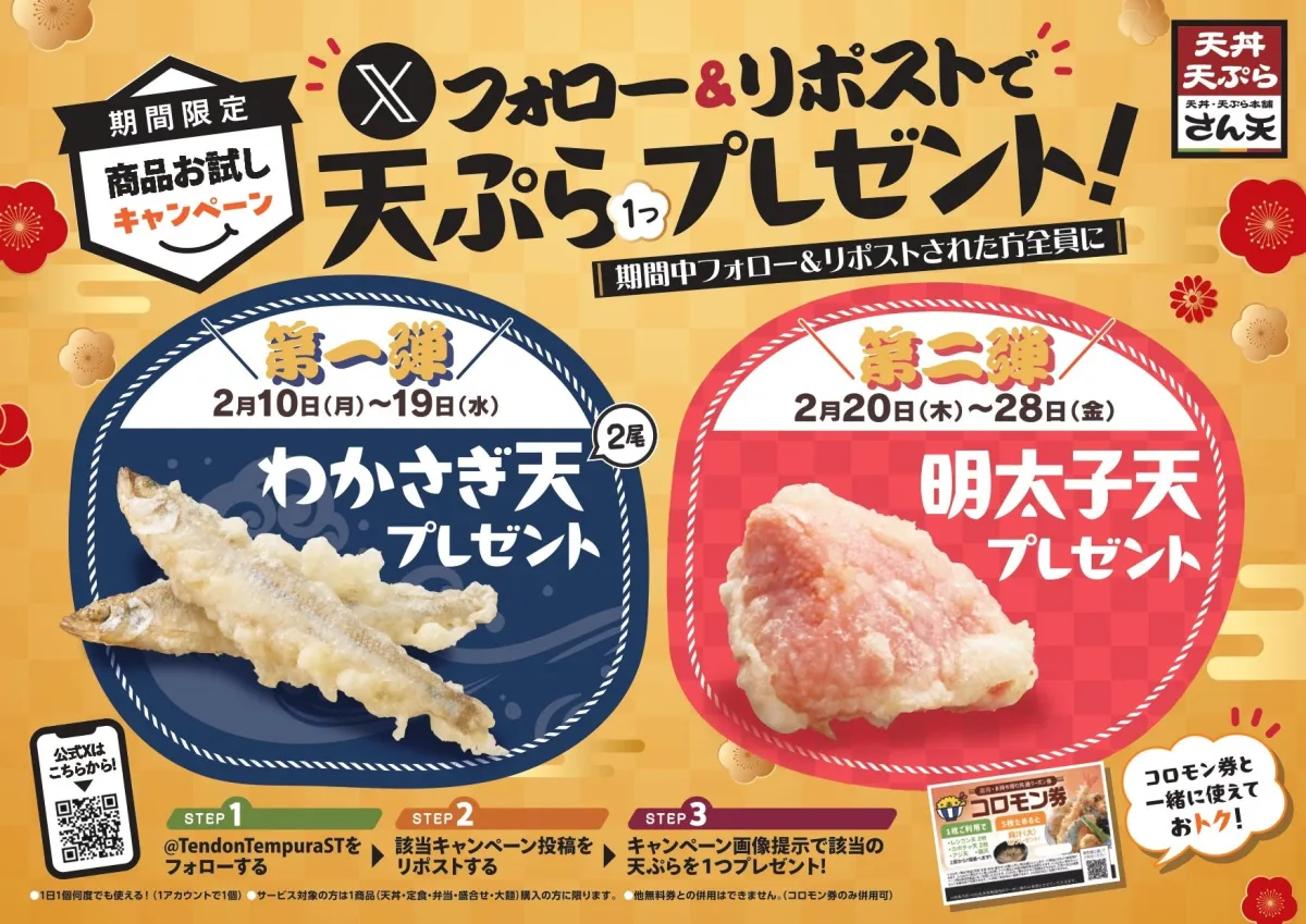 大阪を拠点に運営される「天丼・天ぷら本舗 さん天」が、新たに期間限定のお試しキャンペーンを開催します!このキャンペーンは、2025年2月10日から28日までの期間中、公式Xをフォローするだけで、何度でも揚げたての天ぷらを楽しむことができるという、嬉しい内容となっています。