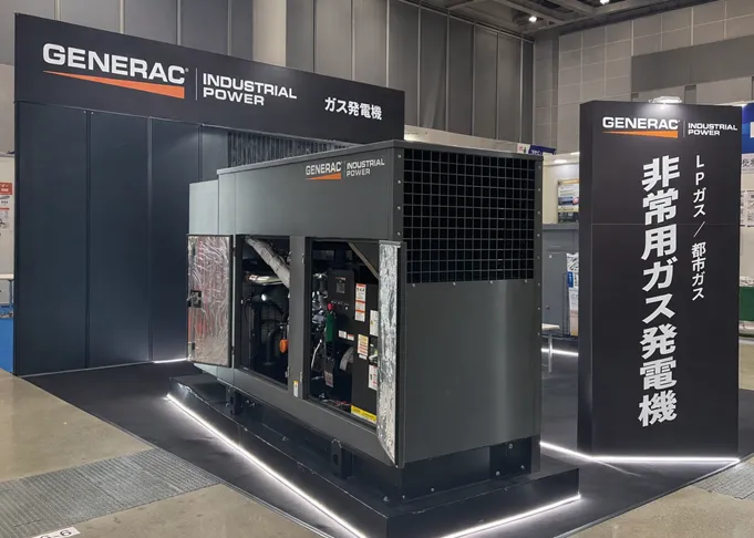 展示ブースでは、GENERACの非常用ガス発電機が注目されました。9kWから1000kWまで対応可能で、住宅や小規模施設から医療施設、商業施設、工場、インフラ関連施設まで、様々な用途に柔軟に対応できます。