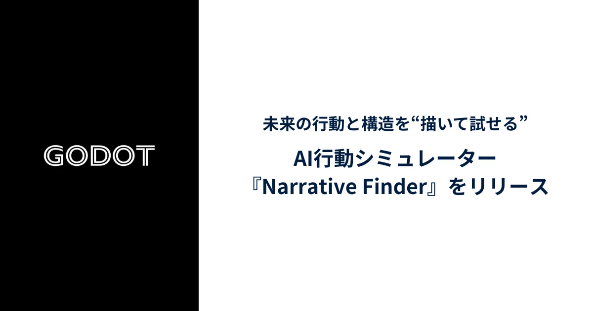 兵庫県神戸市に本社を置く株式会社Godot(ゴドー)は、2025年11月25日(火)に最新のAI行動シミュレーター『Narrative Finder(ナラティブ・ファインダー)』を発表しました。このプロダクトは、人々や組織、さらには都市がどのように未来に「動く」のかをAIエージェントの相互作用を通じて構造的に可視化し、変化の時代において重要な意思決定を支援することを目的としています。