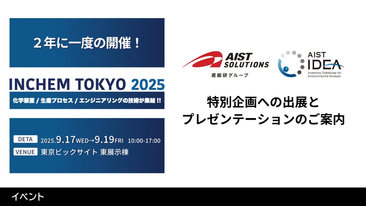 9月18日(木曜日)11:10~ ステージ1で、「環境負荷定量化の必須DB『AIST-IDEA』」というテーマでの講演では、化学分野におけるAIST-IDEAの活用方法について説明されます。
