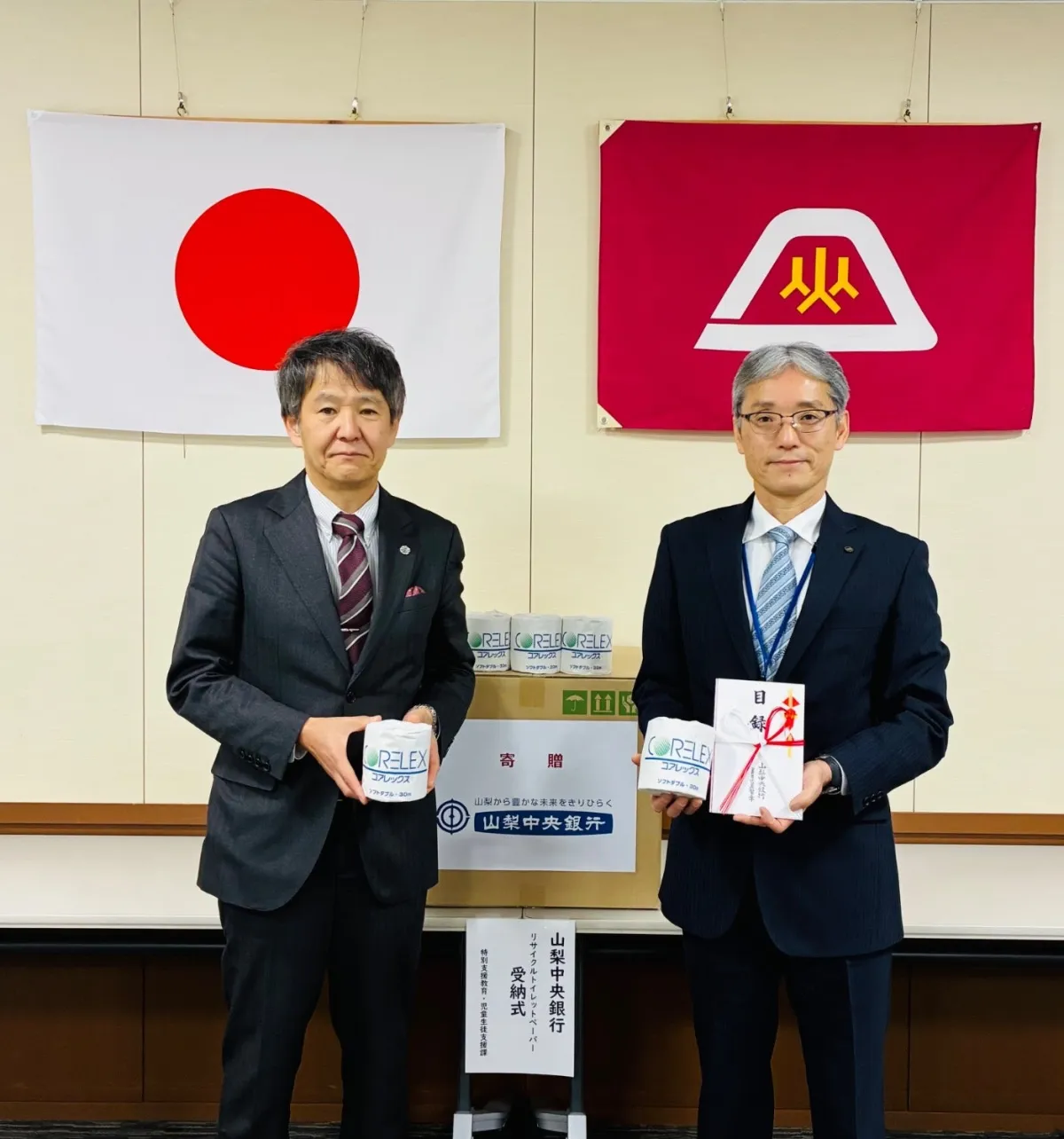 2023年2月27日、山梨中央銀行の頭取 古屋賀章氏が元気な地域づくりを目指し、県内にある特別支援学校14校に対し、環境に配慮した「リサイクルトイレットペーパー」を寄贈しました。この取り組みは、使用済みの紙文書を再生利用したもので、合計5,000ロールが贈られています。