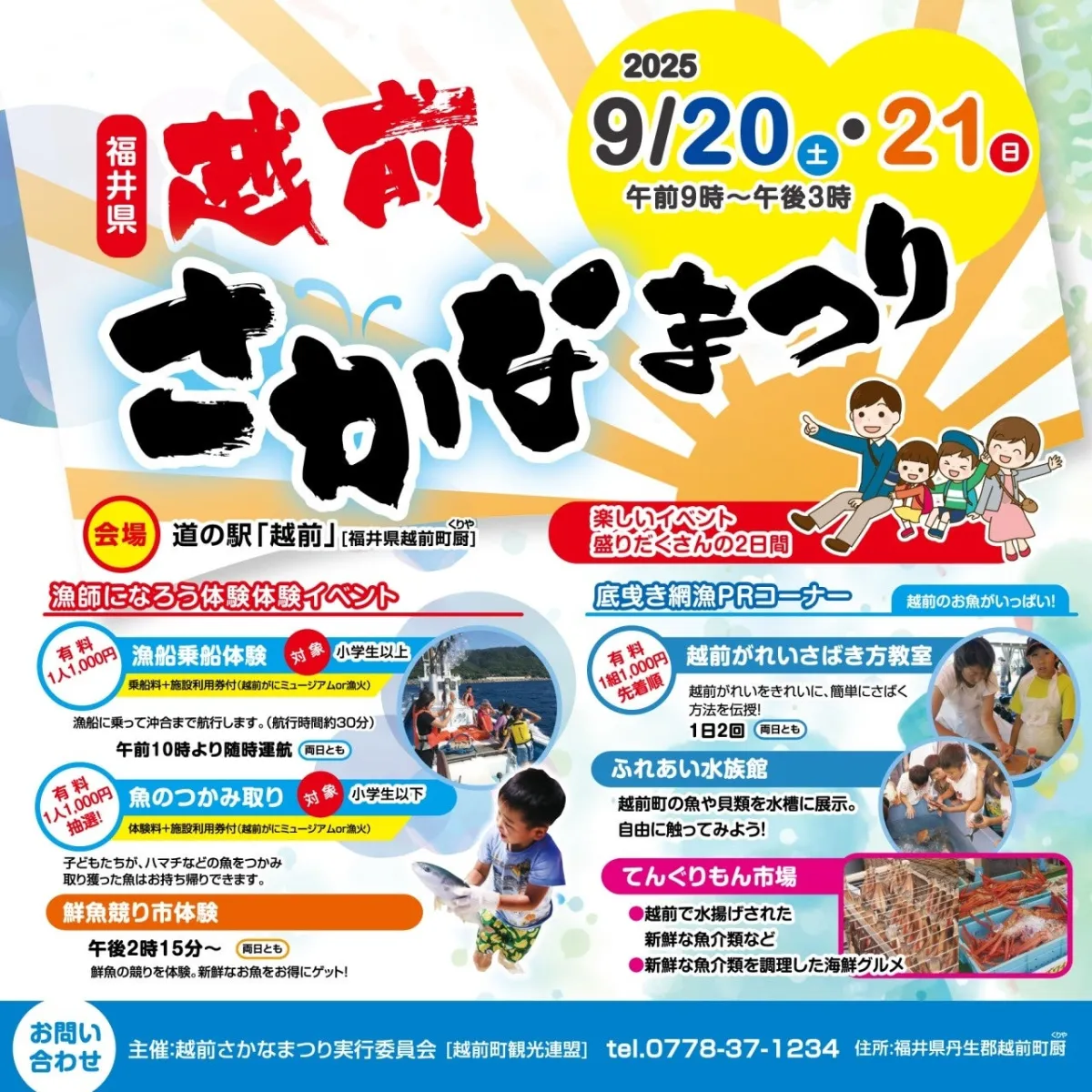 越前町は古くから漁業が盛んで、多くの温泉宿や飲食店も立ち並び、観光地としても人気です。特に、9月1日に解禁される「底びき網漁」が行われるこの時期は、一番多くの種類の魚が水揚げされる絶好のシーズンです。参加者は、新鮮で美味しい海産物を堪能し、様々な体験イベントで思い出を作ることができます。