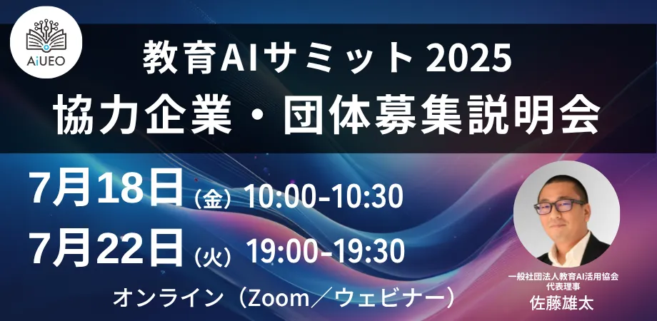 教育現場におけるAIの活用が進む時代。一般社団法人教育AI活用協会(所在地:東京都港区、代表理事:佐藤雄太)では、2025年8月22日(金)に衆議院第一議員会館にて開催される「教育AIサミット2025 〜EDU HEROES あなたに託す教育の未来へのバトン〜」に向けて、協力企業や団体の募集を開始しました。そのため、特定の企業や団体向けのオンライン募集説明会が予定されています。
