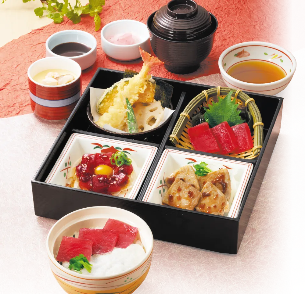この御膳では、様々なまぐろ料理を一つのセットで楽しむことができます。具体的には、まぐろのお造りや、特製たれで仕上げたまぐろのユッケ仕立て、そしてじっくり焼き上げられたまぐろのステーキが味わえます。また、まぐろとの相性が抜群のとろろをのせた「まぐろの山かけ丼」も楽しめます。これらに天ぷら盛り合わせ、茶碗蒸し、赤だしがセットになって、贅沢な一品に仕上がっています。