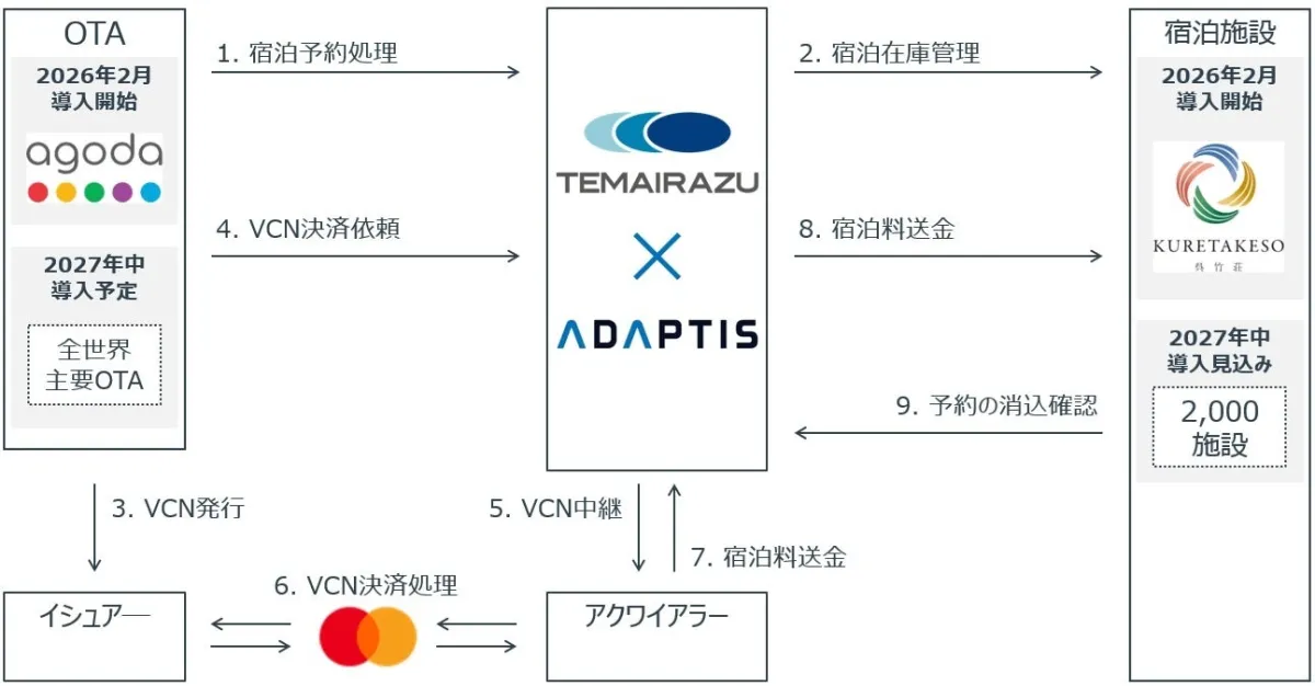 手間いらず株式会社と株式会社NTTデータが2026年2月20日から、宿泊予約から精算までを自動化する新しいサービスの提供を開始します。このサービスは、宿泊施設が複数のオンライン宿泊予約サイト(OTA)を一元管理できる「TEMAIRAZU」と、Mastercardが提供するバーチャルカード番号(VCN)を連携させ、海外OTA経由の宿泊予約から決済までをスムーズに処理します。これにより、宿泊施設の業務負担を大幅に軽減し、入金の安定化や早期化を実現、キャッシュフローの改善を図ることが目的です。