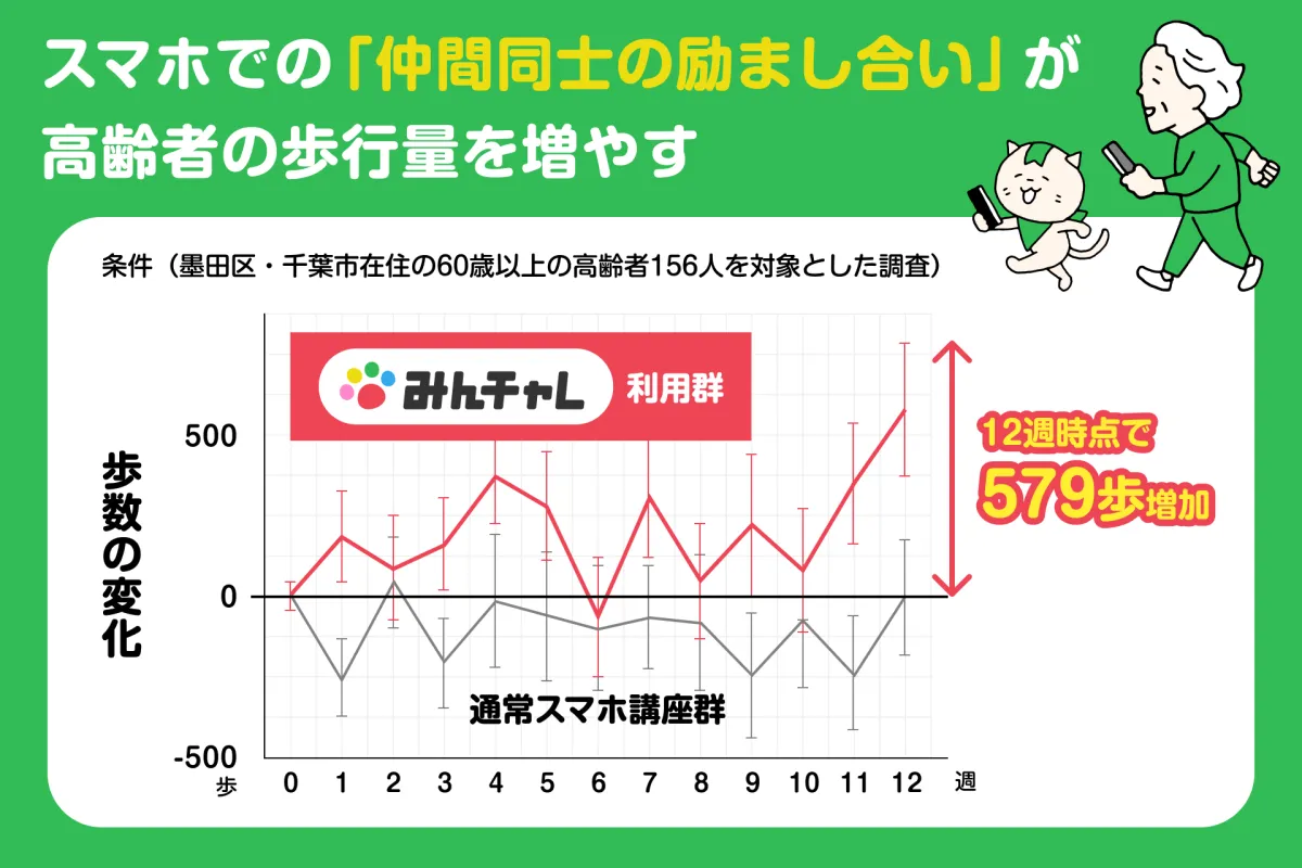 本研究では、墨田区と千葉市に住む60歳以上の156名の高齢者を対象にしたクラスター無作為化比較試験が実施されました。その結果、デジタルピアサポートアプリを利用したスマートフォン講座を受けた高齢者は、通常のスマートフォン講座のみを受けた高齢者と比べて、12週間後に1日平均580歩も歩く量が増加したことが報告されています。