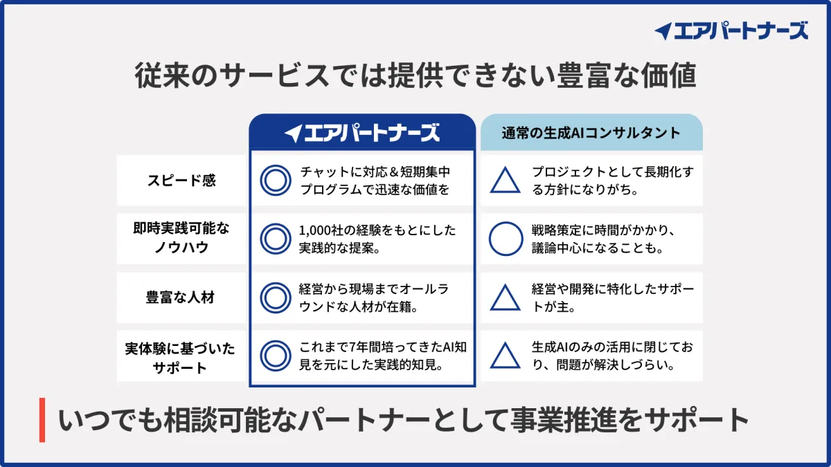 豊富なノウハウの提供: 1000社分のAI活用に関する知見が詰まったプロ人材による支援を手軽に受けられます。
