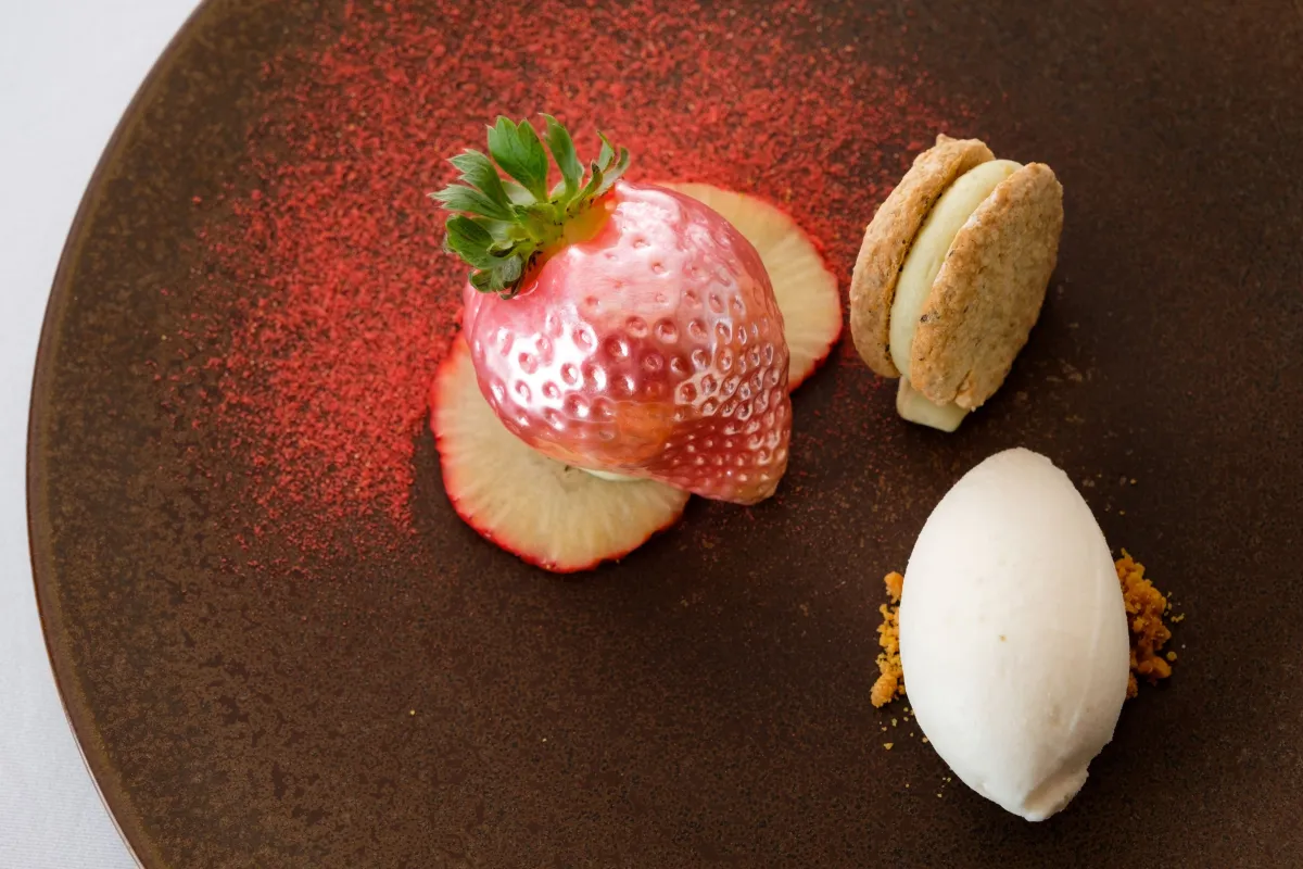 また、博多の“みつのか”を使用したデザートも楽しめます。見た目は本物の苺のようですが、実は飴細工。中には筑後市の特産品である苺とマスカルポーネが詰め込まれており、春の訪れを優しく表現しています。