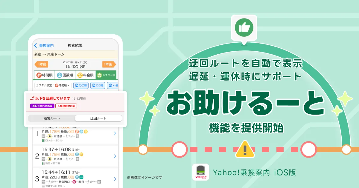 公共交通機関を利用する際、予期しないトラブルによって移動が困難になることがありますよね。「Yahoo!乗換案内」は、こうした不安を軽減し、スムーズな移動をサポートすべく機能の改善や新しい機能の追加に取り組んでいます。今回の「お助けるーと」は、その一環として登場しました。