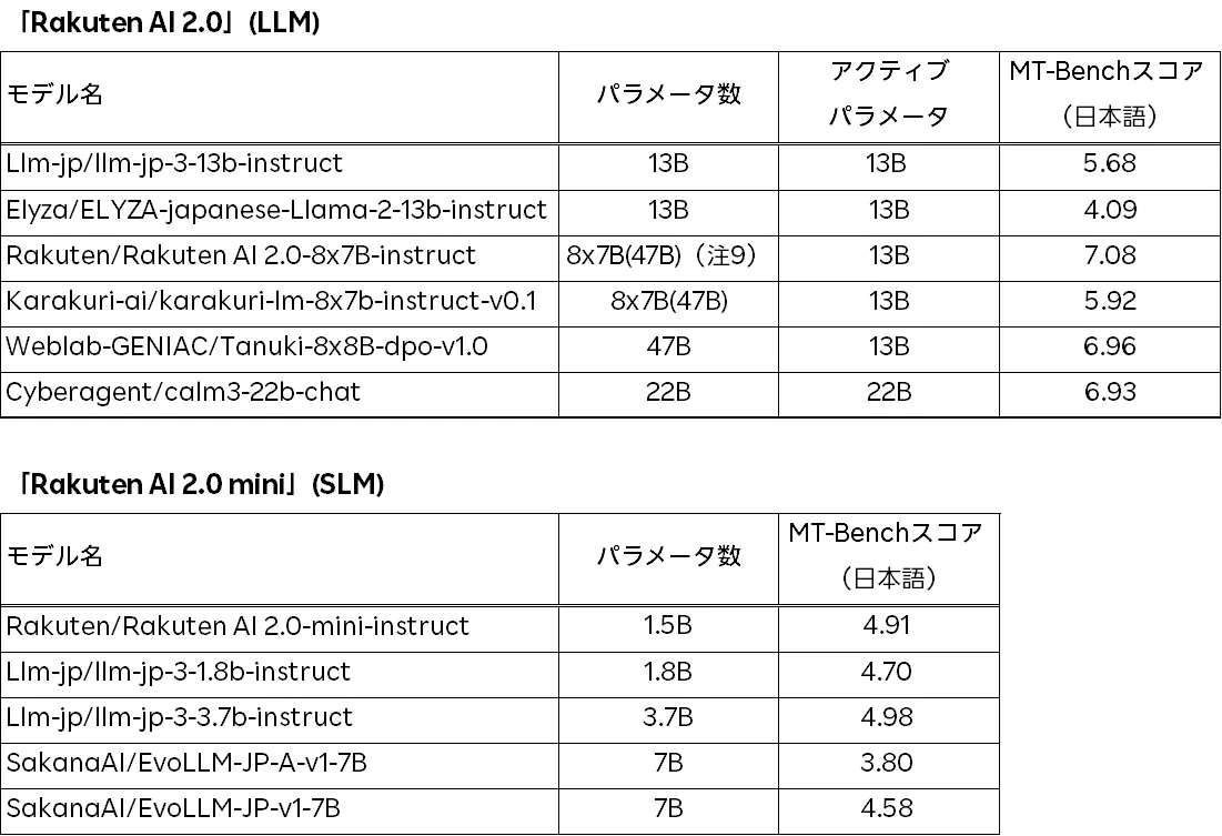 日本語版MT-Benchというベンチマークを用いて評価を行ったところ、「Rakuten AI 2.0」は同規模の他モデルと比べても最高のパフォーマンスを誇り、「Rakuten AI 2.0 mini」も同様に優れた結果を得ています。これらのモデルは、テキスト生成の多岐にわたるタスク、例えばコンテンツの要約や一般的な質問への回答などに活用でき、商業利用が見込まれています。