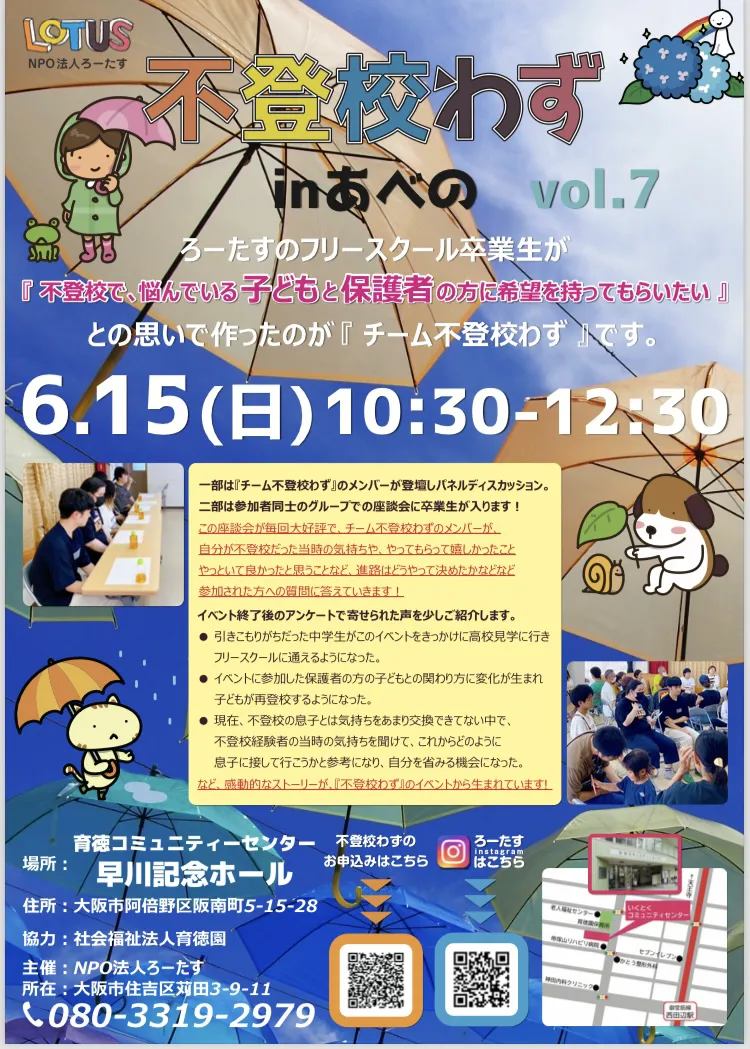 今回の『チーム不登校わず』のイベントvol.7は、阿倍野区にて開催されます。イベントは二部構成となっており、一部では卒業生が登壇し自身の経験を語ります。二部では、参加者同士でのディスカッションに卒業生が加わり、気軽に意見交換ができる座談会形式で行われます。これにより、参加者はただ聞くだけでなく、実際に自分の考えや悩みを共有できる場となります。