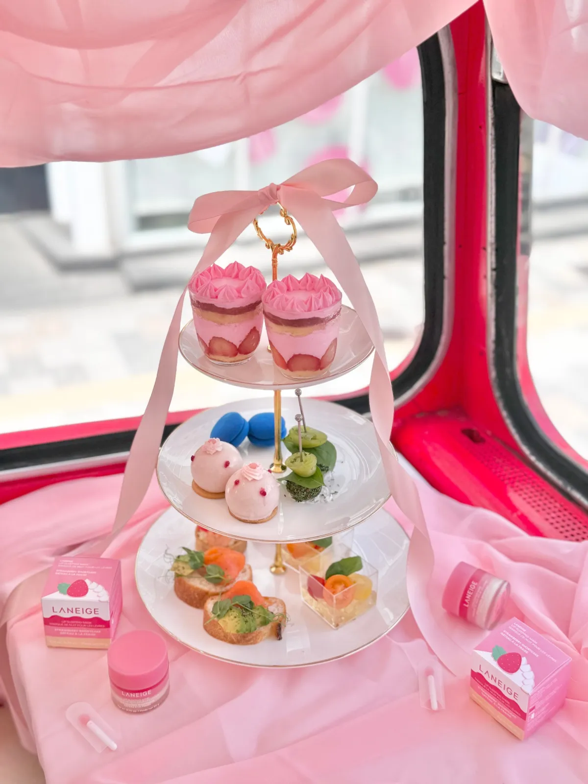 今回のツアーは、LANEIGEの特色を活かしたアフタヌーンティーを楽しむことができる特別な体験です。参加者は、LANEIGEをテーマにしたオリジナルメニューの全7品を堪能できます。メニューには、リップスリーピングマスクを模したショートケーキをはじめ、ウォータースリーピングマスク仕立てのブルーベリーマカロンや、シカスリーピングマスクのバジルミートボールなど、美容を意識したスイーツが並びます。