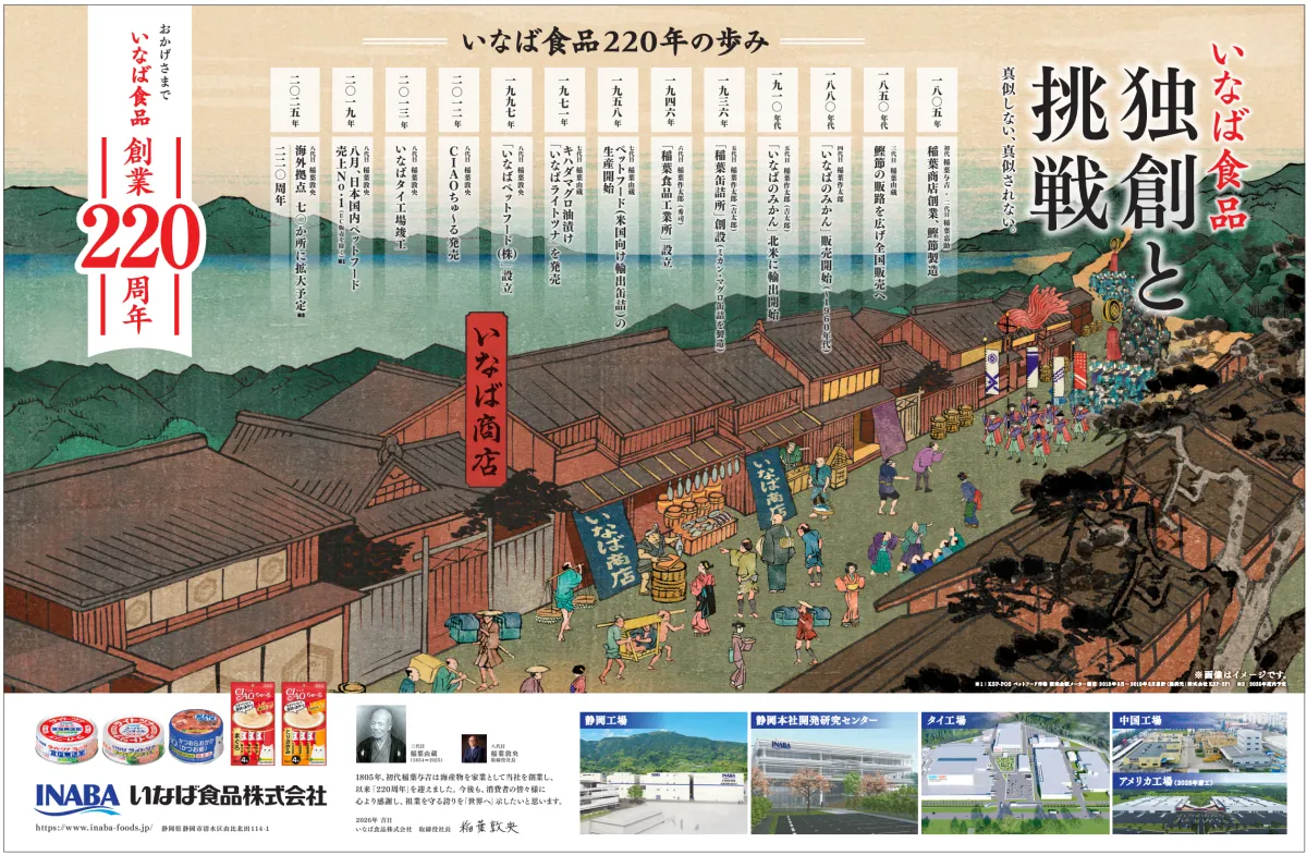 2026年1月27日、いなば食品株式会社は創業220周年を記念した見開き全面広告を、全国紙である読売新聞に掲載しました。この広告は、いなば食品が掲げてきた企業のDNA「独創と挑戦」をしっかりと表現しています。