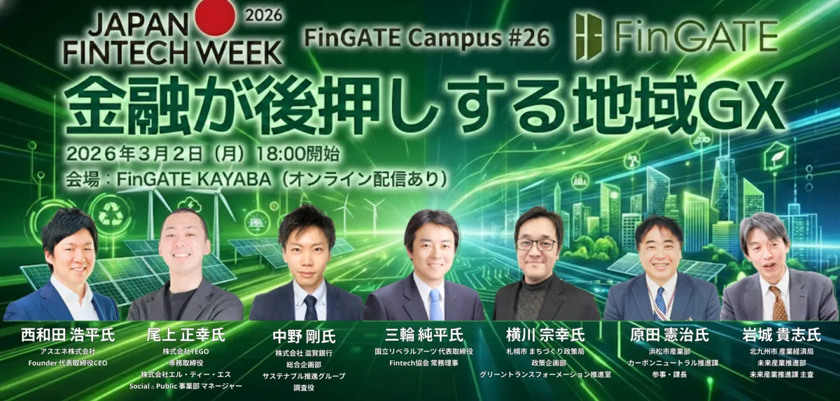 アスエネ株式会社が、金融庁とFintech協会が主催する「Japan Fintech Week 2026特別企画」に参加します。このイベントは、地域経済におけるグリーントランスフォーメーション(GX)の必要性と、金融の役割をより深く理解するための機会です。