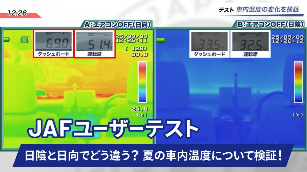 JAFが発表した動画シリーズの一環として、「日陰に駐車した場合」と「日なたに駐車した場合」における、車内温度の違いについて検証がされた結果、夏場の車内は想像以上に危険な環境になり得ることが分かりました。特に、外気温が高く、直射日光が差し込むような条件下では、エアコンを使用していても油断は禁物です。