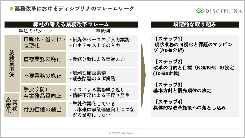 ディシプリナは、今後三機工業のバックオフィス部門に対して次のようなサポートを行います。まずは、業務プロセスの可視化と分析を通じて現状の課題を明確にし、次にDXによる具体的な解決策を立案します。また、RPAやAIといったデジタルツールの利用による業務の自動化や効率化を企画し、実行支援を行います。さらに、DX施策の効果測定とその改善もディシプリナの業務改革フレームワークを用いて行う予定です。