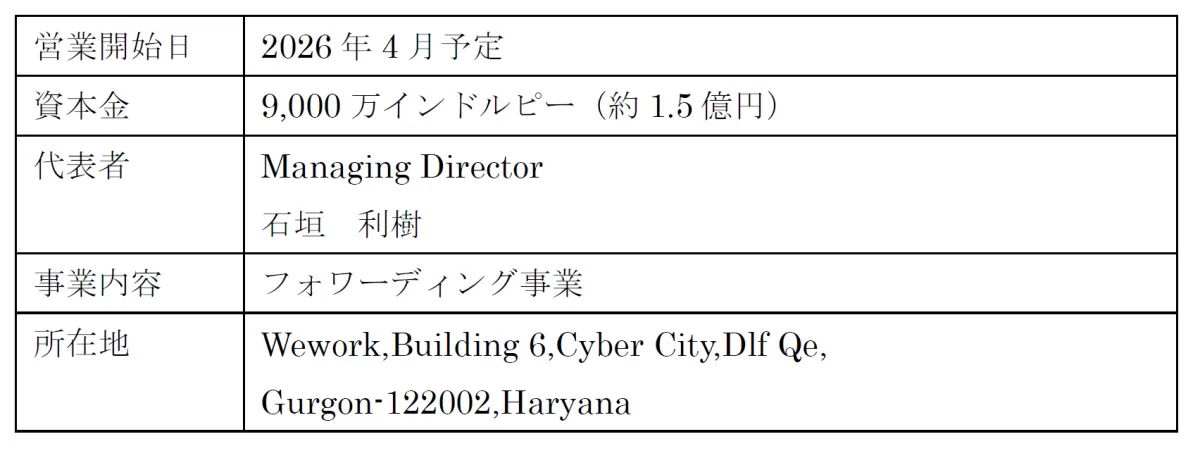 2025年12月26日に法人登記を完了し、2026年1月14日のオープンに向けて事務所が設けられることとなります。営業開始は2026年4月を予定しており、順次物流事業を推進していく方針です。インドでは急速な経済成長が見られ、特に物流インフラの必要性が高まっています。