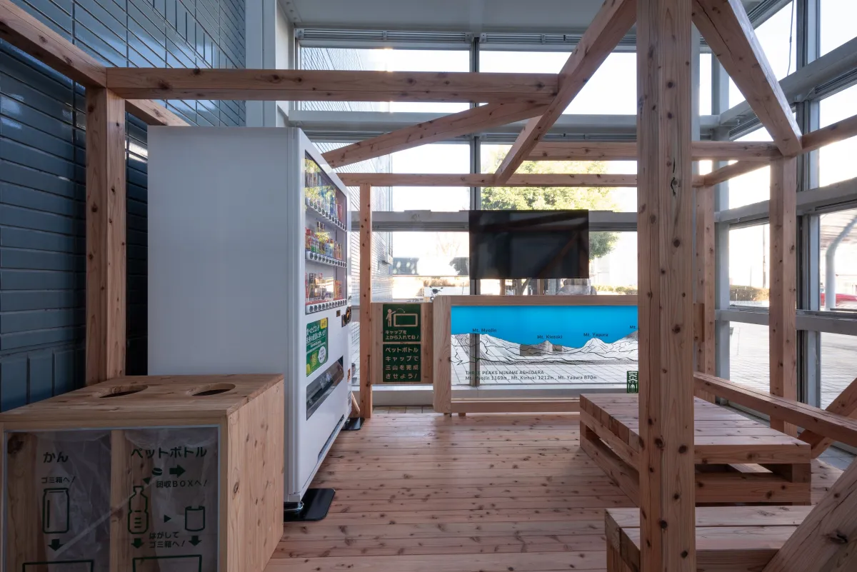 「カーボンニュートラル啓発空間」は、南足柄市で採れるスギの間伐材を活用して建設されています。市役所を訪れた来場者は、カーボンニュートラルや資源循環に関する展示を閲覧しながら、環境問題への理解を深めることができます。また、足柄三山をテーマにしたペットボトルキャップの回収オブジェも設置され、訪れる人々に楽しみながら環境について考えてもらえる工夫が凝らされています。