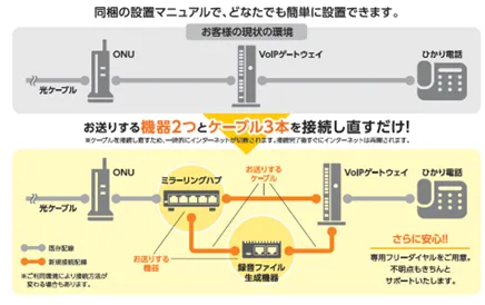 「RecACE」を利用するための手続きは非常に簡単です。まず、現在使用している電話に、録音ファイルを生成するための機器とミラーリングハブを接続するだけ。この2つの機器を郵送し、設定が完了すれば、通常の通話が自動で録音されていきます。特別な工事などは不要で、面倒な手続きがなく、スムーズに導入できるのは大きな魅力です。