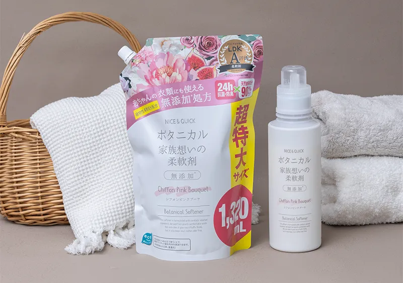 2021年に発売された「ボタニカル 家族想いの柔軟剤」は、赤ちゃんの衣類にも安心して使用できる無添加の製品として、多くの支持を集めています。『シフォンピンクブーケ』の香りは、華やかなピオニーやローズを基調に、みずみずしいフィグとカシスでアクセントを添えた優しい香りです。まるで心を温めるようなフレグランスが、洗濯物から漂い、心地よい空間を演出します。