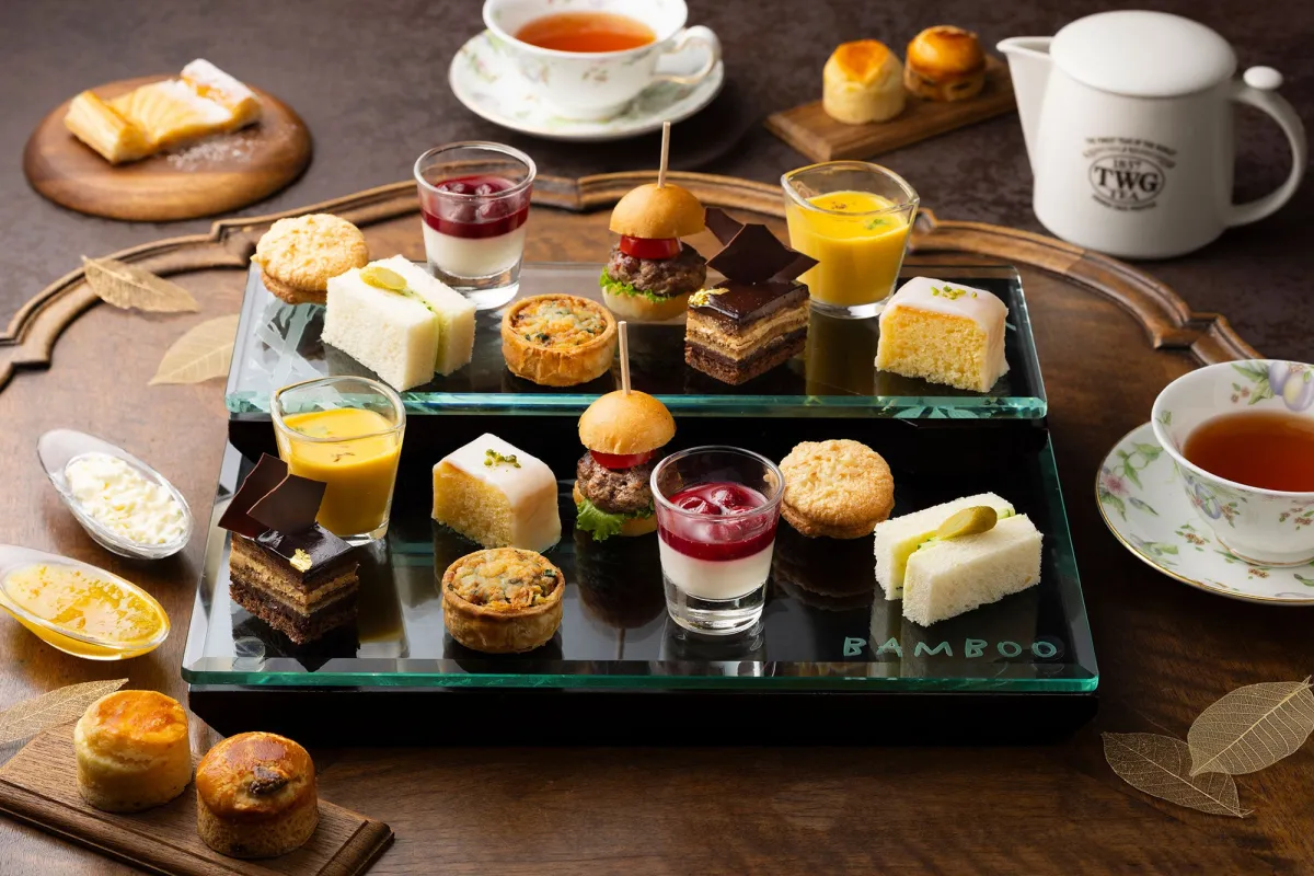 ロビーラウンジ バンブーで展開されるアフタヌーンティーは、サクサクのアップルパイやオペラのような伝統のお菓子が並び、セイボリーにはキッシュやキューカンバーサンドウィッチがあります。また、王道のスコーンには、クロテッドクリームが添えられています。これらのメニューは、時代を超えて愛され続けるものであり、料理の品格を味わうことができます。