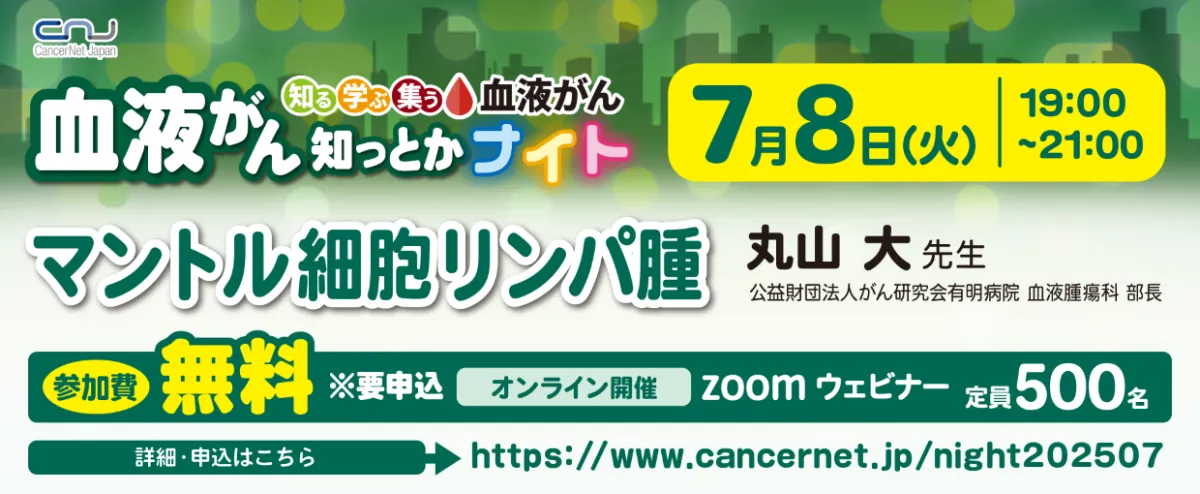認定NPO法人キャンサーネットジャパンが主催するオンラインセミナー「血液がん知っとかナイト」に関するご案内です。2025年7月8日、特に希少な血液がんである「マントル細胞リンパ腫」に焦点を当て、最新の研究成果や治療法についての講演が行われます。参加は無料で、全国そして海外からも申し込み可能です。