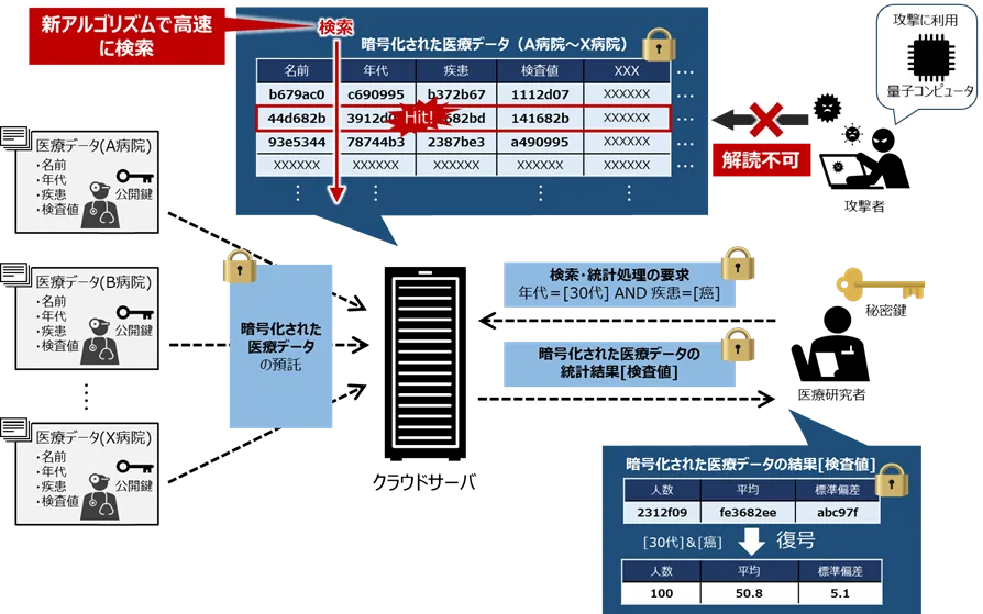 日立は、量子コンピュータによる脅威に対応するため、既存の暗号技術を見直し、「格子暗号」という耐量子性を有する公開鍵暗号の技術を基盤とした新しい検索可能暗号を開発しました。この技術は、クラウドサーバに格納されている暗号化データに対して、従来技術の10倍の速度で検索を行えるという特性を持っています。
