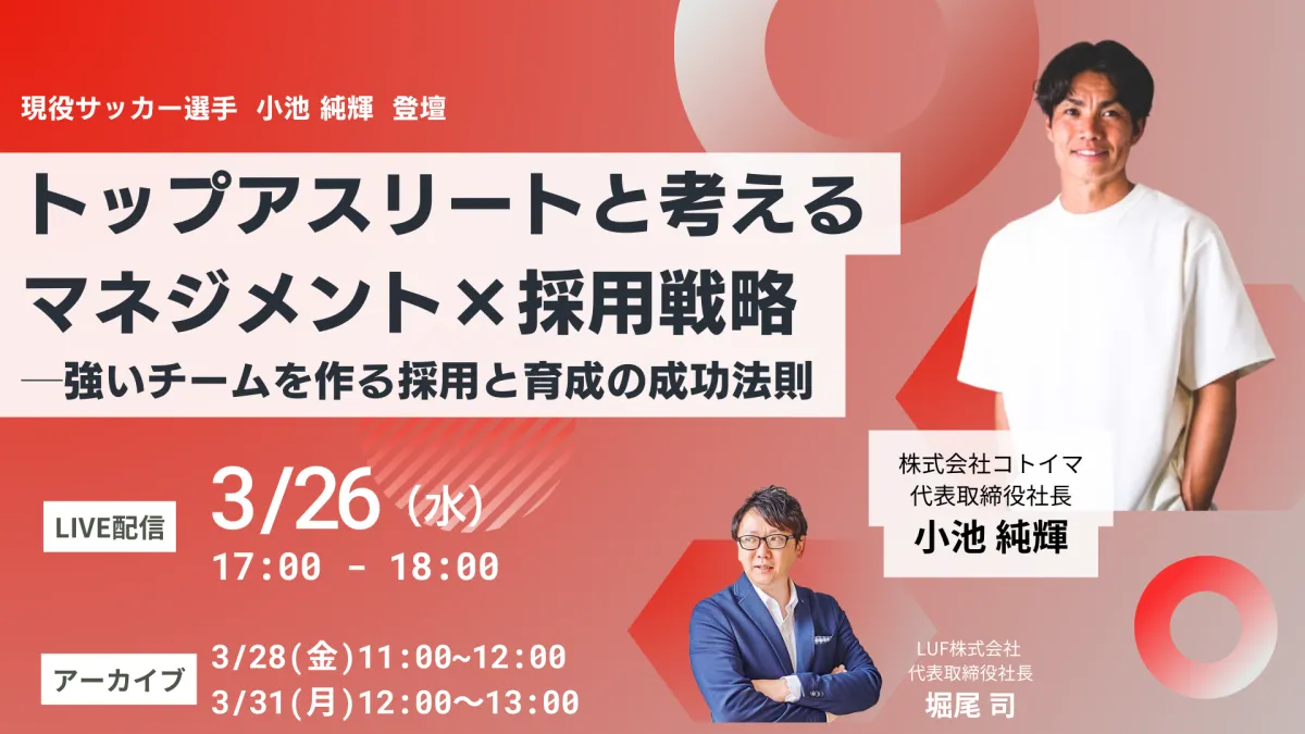 近年、ビジネス界では採用と育成の重要性がますます高まっています。特に、アスリートの経験を活かす傾向が注目を集めており、これは新たな人材戦略の扉を開いています。先日行われたセミナー「トップアスリートと考えるマネジメント×採用戦略──強いチームを作る採用と育成の成功法則」にて、プロサッカー選手からビジネスの世界へ挑戦する小池氏とLUF株式会社の代表堀尾氏が登壇しました。