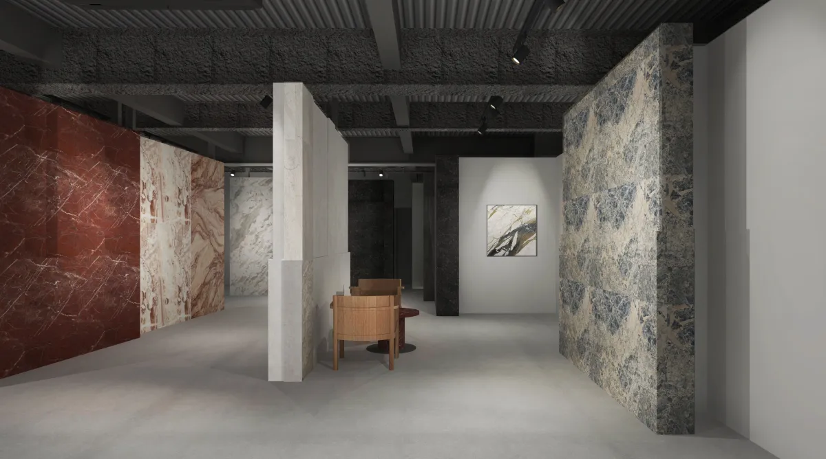 ショールームは、著名な「Teruhiro Yanagihara Studio」の手によってデザインされ、単なる展示場ではなく、石の質感や素材感を直接体験できる二層構造の空間に進化した。デザインのテーマは「暗闇の中に影を見つけ、光の中に輪郭を見る」。これは、自然素材である石材の重厚感と、光によって引き出される繊細な表情のコントラストを表現している。