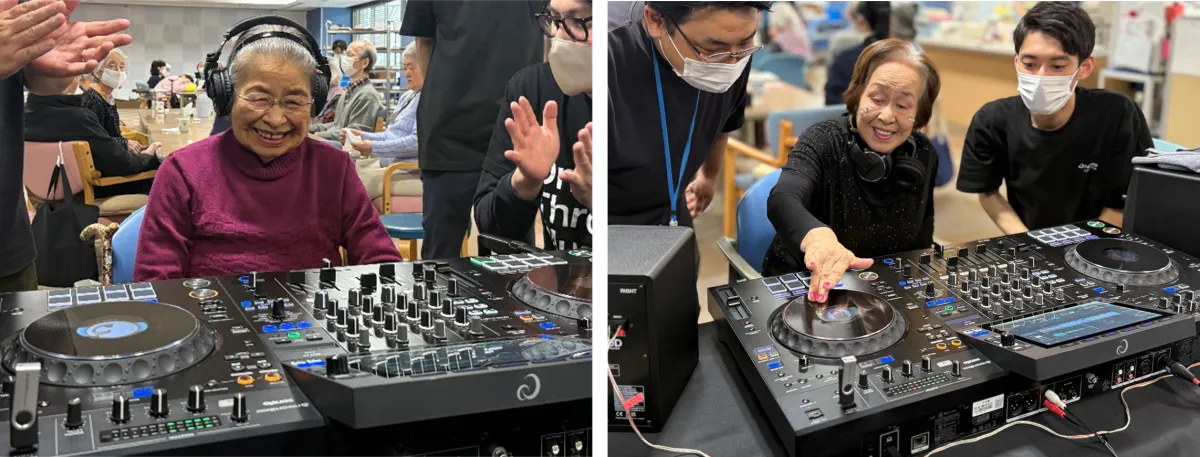 イベント当日、高齢者の参加者たちがDJ体験ブースに足を運びました。特に目を引いたのは、まさに97歳の女性が初めてDJ機材に挑戦する姿。施設内で「新しいことを始められて嬉しい」と笑顔で語る姿が印象的でした。