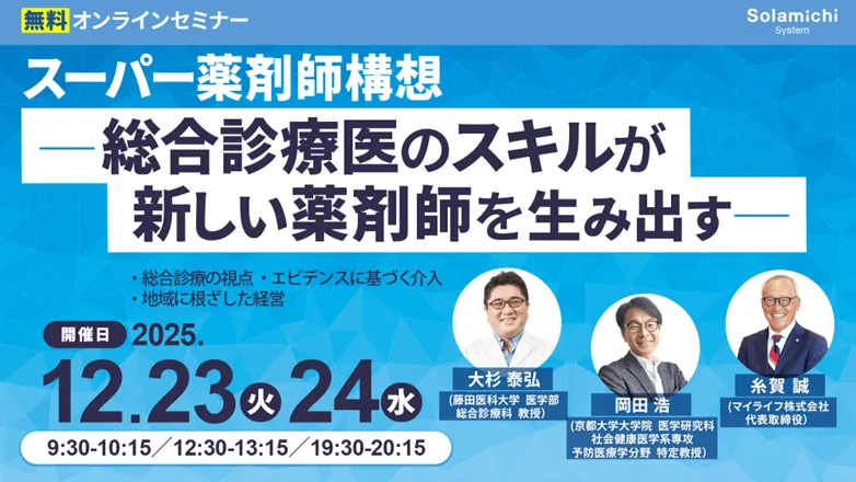 この冬、業界が注目するセミナーの一つ「スーパー薬剤師構想」が、録画配信されることが決まりました。開催日は12月23日(火)、24日(水)。多くの希望者から申し込みを受けて、リアルセミナーを行っている株式会社ソラミチシステムが、医療界の最新トレンドを発信します。今回は、総合診療医のスキルを元に新しい薬剤師の役割を探る内容となっています。